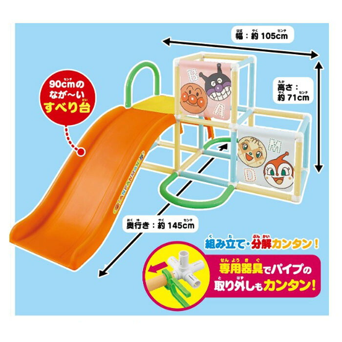 〜遊びながら身につく8つの能力〜 ・反応能力 ・手先の器用さ ・バランス感覚 ・柔軟性 ・判断力 ・想像力 ・好奇心 ・脳の活性 ●セット内容 : 本体×1、のれん×2、パイプはずし器具×1、ボール×1、取扱説明書 サイズ W1030×H710×D1450 mm 対象年齢 2歳〜5歳 著作権等 (c)やなせたかし/フレーベル館・TMS・NTV ※大型商品のため、ラッピングはできません。